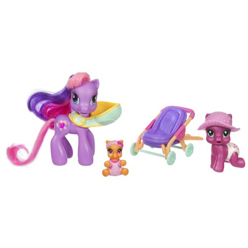 Little SCOOTALOO loves to play outdoors, especially with her big sister CHEERILEE!Whos ready to head out and about for the day Your CHEERILEE and SCOOTALOO pony figures! Put your adorable little SCOOTALOO friend in her carrier or her stroller so shes snug and safe and ready for the trip Your Mom pony figure is always happy to let your CHEERILEE pony figure lend a helping hand, so this sweet pony big sister helps push the stroller. Whether doing errands or visiting friends, your cute pony family is sure to win smiles everywhere you take them!Threepack includes CHEERILEE, SCOOTALOO and Mom pony figures with hat, carrier and stroller accessories.